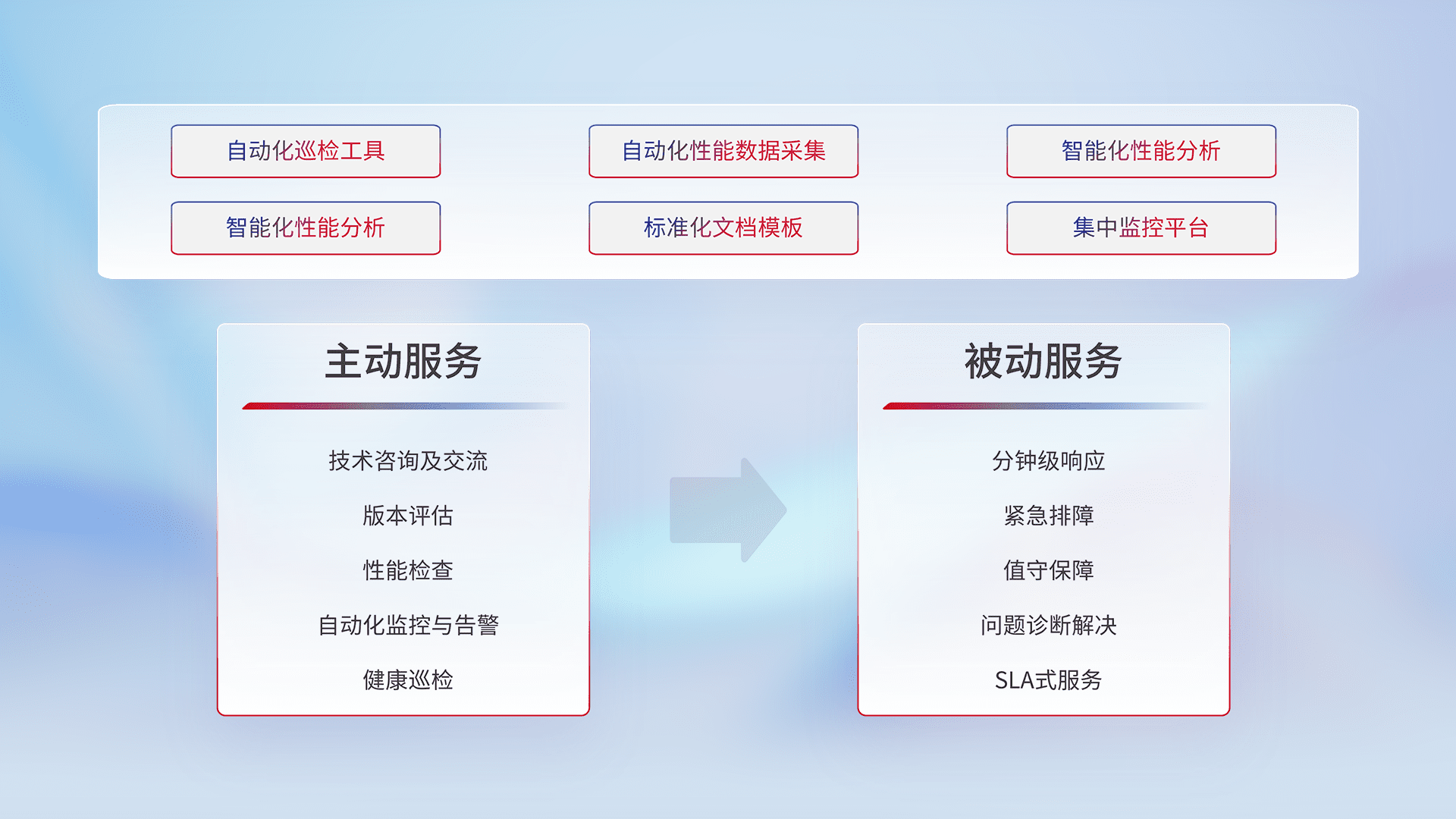 智能化工具和标准化文档,,保障服务质量,,,提供主动服务(包含技术咨询、、版本评估、、、性能检查、、、、自动化监控与告警、、、、健康巡检)和被动服务包含(分钟级响应、、紧急排障、、、、值守保障、、问题诊断解决、、、SLA服务)。。。。